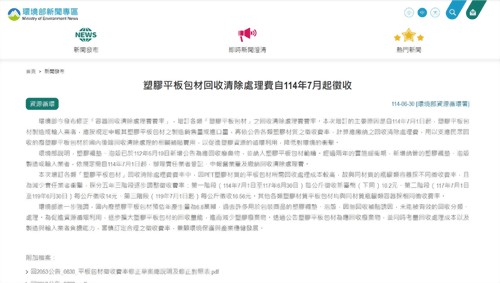 環境部今發布修正「容器回收清除處理費費率」,增訂各類「塑膠平板包材」之回收清除處理費費率。本次增訂的主要原因是自114年7月1日起,塑膠平板包材製造或輸入業者,應按規定申報其塑膠平板包材之製造銷售量或進口量,再依公告各類塑膠材質之徵收費率,計算應繳納之回收清除處理費,用以支應民眾回收的廢塑膠平板包材於國內後端回收清除處理的相關補貼費用,以促進塑膠資源的循環利用,降低對環境的衝擊。 環境部說明,塑膠襯墊、泡殼已於112年5月19日新增公告為應回收廢棄物,並納入塑膠平板包材範疇。經過兩年的實施緩衝期,新增納管的塑膠襯墊、泡殼製造或輸入業者,依規定需自114年7月1日起,辦理責任業者登記、申報營業量及繳納回收清除處理費。 本次增訂各類「塑膠平板包材」回收清除處理費費率中,因PET塑膠材質的平板包材所需回收處理成本較高,故與同材質的瓶罐類容器採不同徵收費率,且為減少責任業者衝擊,採分五年三階段逐步調整徵收費率:第一階段(114年7月1日至117年6月30日)每公斤徵收新臺幣(下同)10.2元、第二階段(117年7月1日至119年6月30日)每公斤徵收14元、第三階段(119年7月1日起)每公斤徵收16.56元。其他各類塑膠材質平板包材均與同材質瓶罐類容器採相同徵收費率。 環境部進一步強調,國內廢塑膠平板包材預估年產生量為6.8萬噸,過去許多用於包裝商品的塑膠襯墊、泡殼,因無回收補貼誘因,未能被有效的回收分類、處理。為促進資源循環利用,逐步擴大塑膠平板包材的回收量能,進而減少塑膠廢棄物。透過公告塑膠平板包材為應回收廢棄物,並同時考量回收處理成本以及製造與輸入業者負擔能力,審慎訂定合理之徵收費率,兼顧環境保護與產業穩健發展。 文章來源:https://enews.moenv.gov.tw/page/3b3c62c78849f32f/161b9c2d-9452-4ed2-bad0-2819f46f5eb1